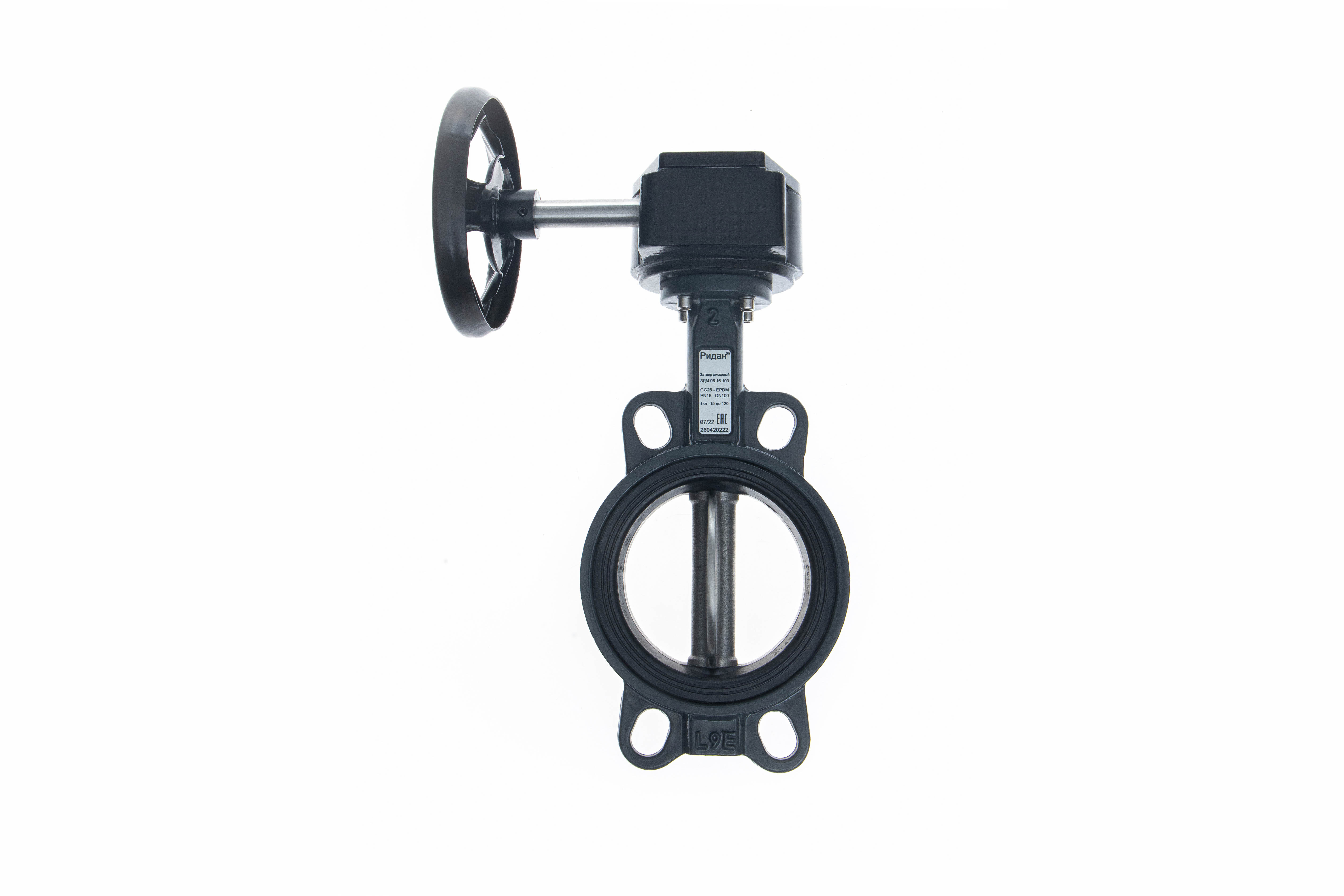 Ридан 082X4430R — Затвор дисковый поворотный ЗДМ 06.16.100, PN16, DN100, корпус GG25, диск — нержавеющая сталь AISI316, уплотнение EPDM, с ручным редукторным приводом